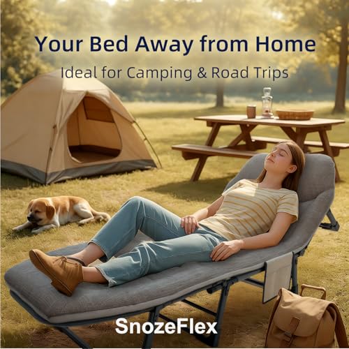 Click for More Images Versatile 3-in-1 Heavy Duty Lounge Chairs: The SnozeFlex camping cot seamlessly transitions from a comfortable recliner to a cozy bed, providing a versatile solution for seating, sleeping, and relaxation all in one...